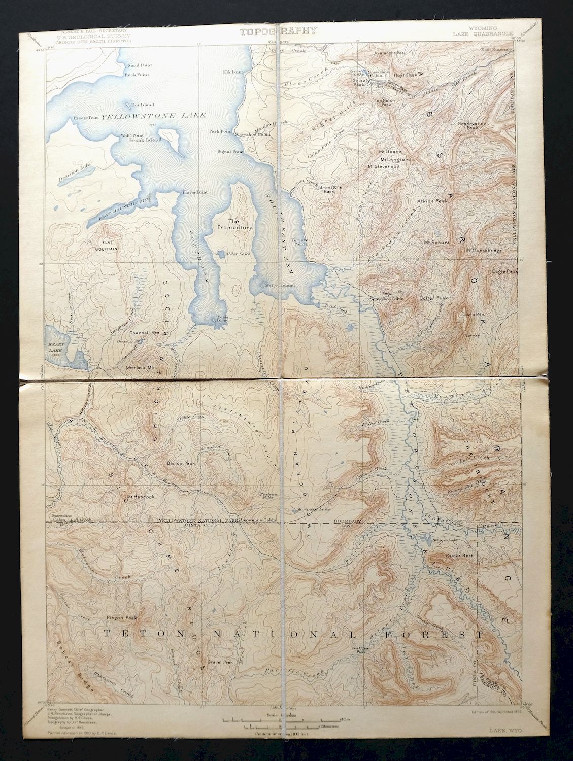 A 1911 edition USGS 30-minute quad, printed in 1922, this antique sheet is in good condition — and notably, it is a rare canvas-backed example, making it exceptionally durable and well-suited to repeated handling or extended study. The map depicts a rugged stretch of the central Yellowstone Plateau and surrounding high country, taking in portions of Yellowstone National Park along with parts of Teton Wilderness, North Absaroka Wilderness, Teton National Forest, and Shoshone National Forest across Fremont, Park, and Teton counties. The canvas backing and folding panel format — collapsing to a compact 7 by 10 inches — make this an unusually practical research document, and the 1911 edition captures this landscape at a period when infrastructure and human presence within the park were still minimal.
