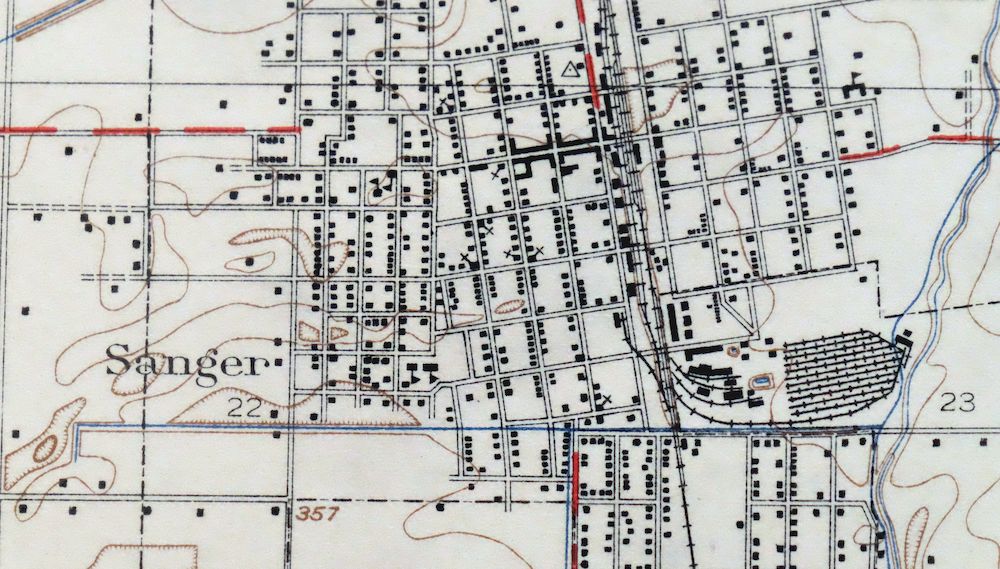 The Sanger map was field surveyed before aerial photography methods were widely used in map data gathering. It was drawn by skilled cartographers at the United States Geological Survey based on plane table field survey information as well as information gathered from local residents in the area. This piece displays the remarkable abilities of early government map makers, who placed a strong emphasis on creating complete, accurate, and cartographically appealing maps.