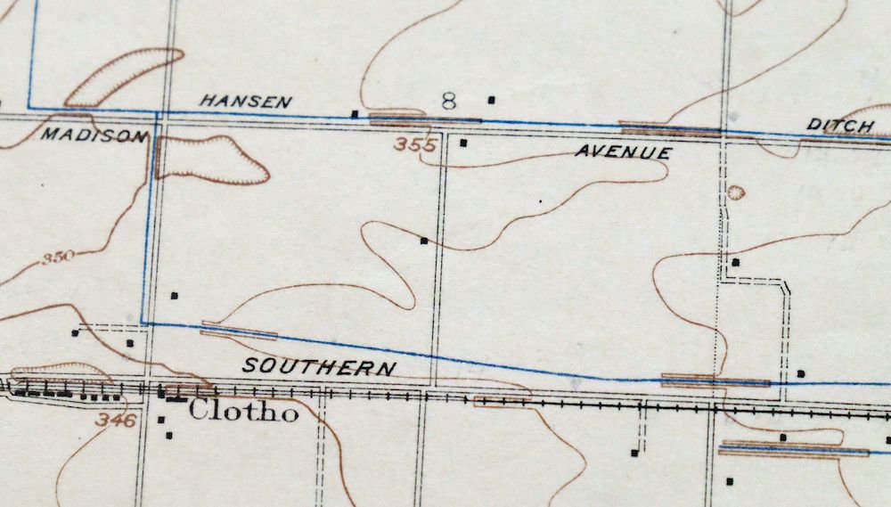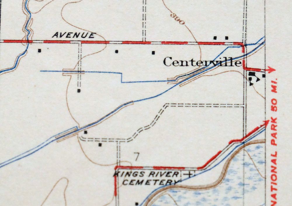 Fascinating historical snapshot of the Sanger region of the San Joaquin Valley, surveyed before the existence of the modern road system, includes rail lines, early lateral and canal alignments, depicts all known structures, churches, and schools that existed at the time of survey.