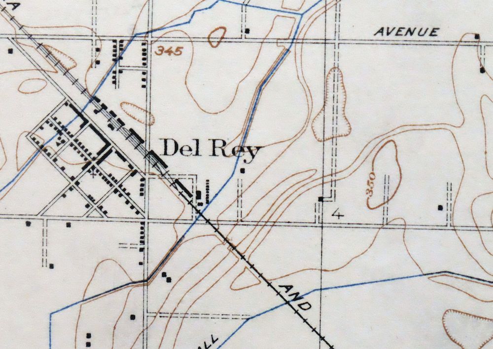 A first-year 1923 print from the USGS 7.5-minute series, this antique sheet is in good condition on thick stock. It depicts the Sanger area of Fresno County in the San Joaquin Valley, taking in the city of Sanger and the town of Del Rey along with the surrounding agricultural lowlands. Surveyed before the modern road system took shape, it records early canal and lateral alignments, rail lines, and individual structures including churches and schools — the kind of detail that makes it a useful document for researchers, local historians, and anyone tracing the built landscape of this part of the valley.