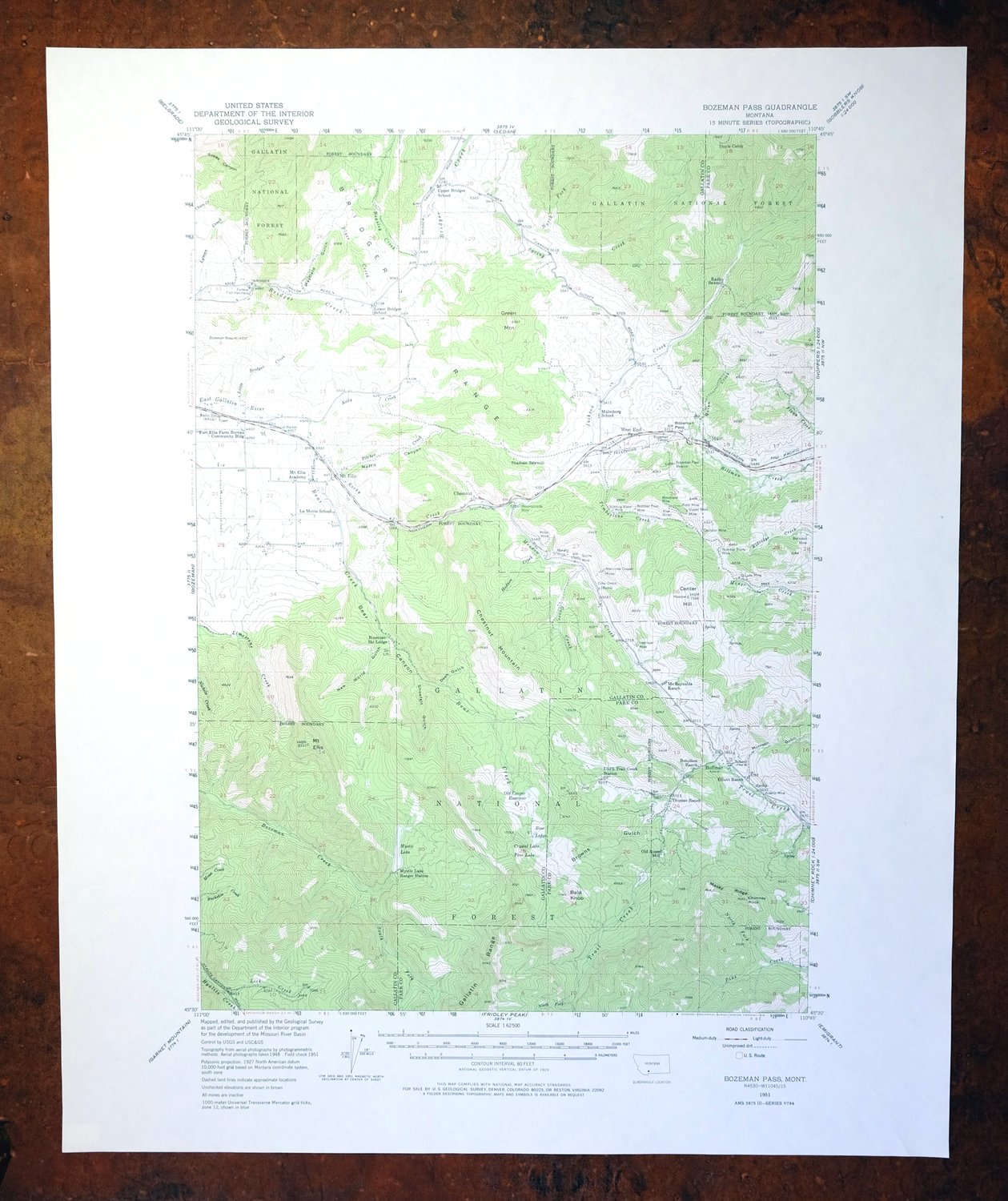 This vintage sheet is a 1951 edition of the Bozeman Pass Montana USGS topographic map. It is an original 44-year-old 1978 United States Geological Survey print in very good condition.