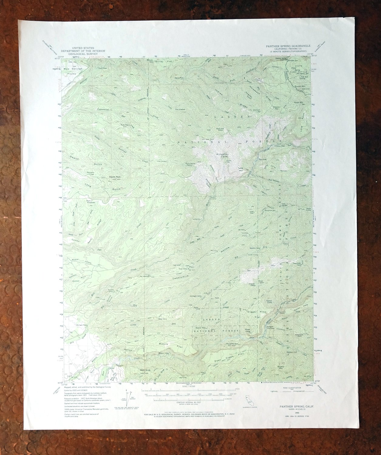 This vintage sheet is a 1953 edition of the Panther Spring California USGS topographic map. It is an original 52-year-old 1970 United States Geological Survey print in very good condition.