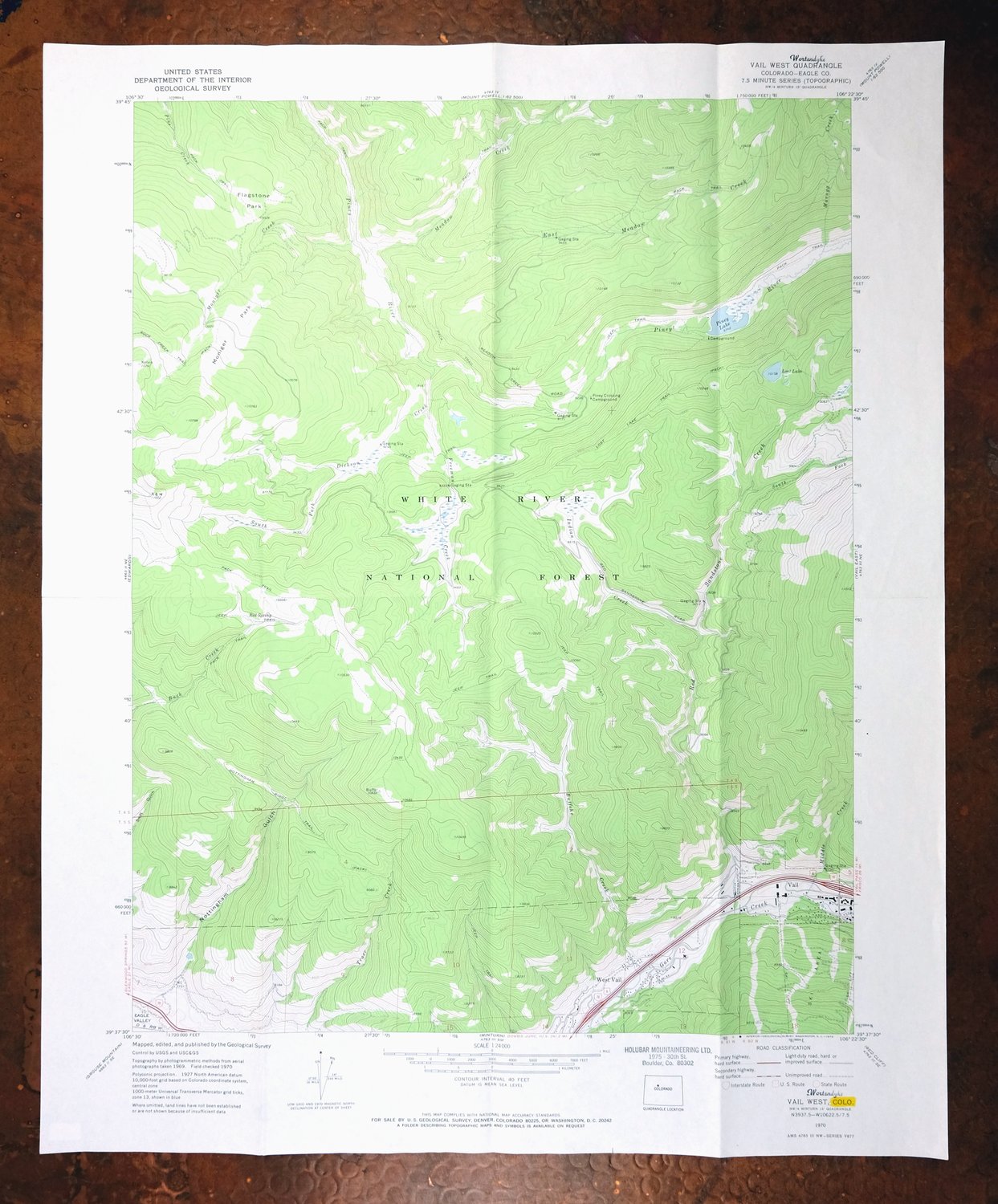 This vintage sheet is a 1970 edition of the Vail West Colorado USGS topographic map. It is an original 49-year-old 1973 United States Geological Survey print in very good condition.