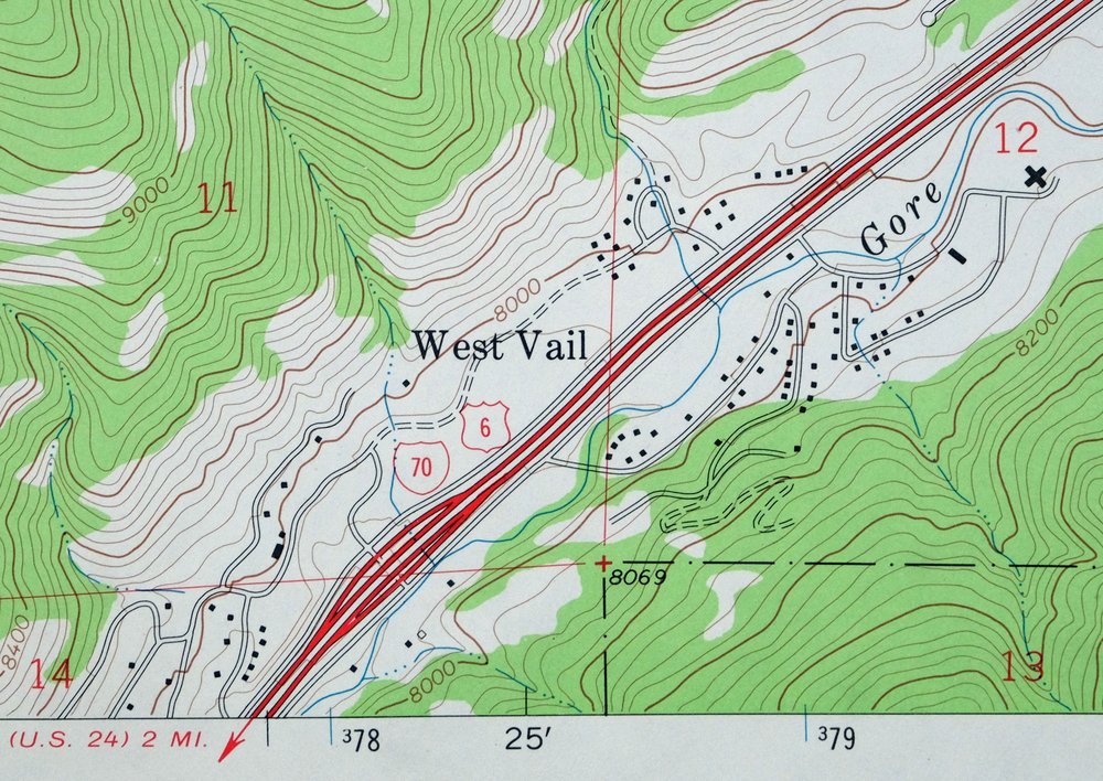 The Vail West 7.5-minute map shows cities and towns, roads, railroads, utilities and energy infrastructure, rivers, creeks, elevation contour lines, public land survey lines, county, state, and other administrative boundaries as they existed at the time of the survey in 1969 and 1970. All known structures (houses, businesses, churches, schools, barns, cabins, etc) are also shown.